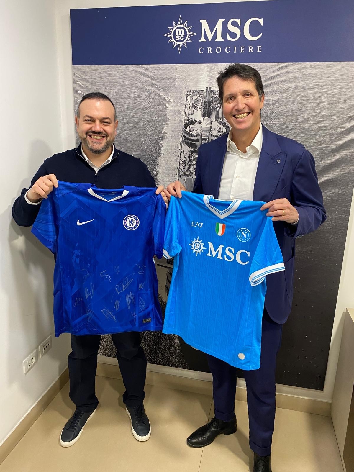 Antonio Paradiso and Leonardo Massa from MSC Cruises swapping shirts before the Napoli v. Chelsea match on 28 January 2026