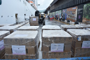 With operational backing from MSC Cruises, the cruise ship MSC Divina transported 3,360 gallons of bottled water and 264 tarpaulins to Jamaica, arrived in Ocho Rios on November 11. These items will help meet immediate needs for safe water and shelter materials identified by relief agencies.
